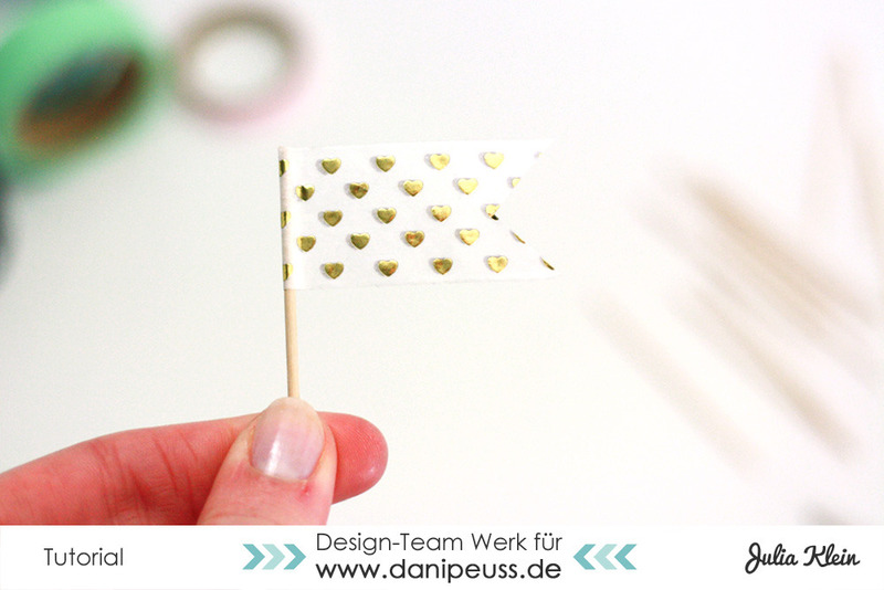 Diese klebt ihr dann fest aneinander und fahrt mit dem Fingernagel einmal an dem Zahnstocher entlang. So klebt alles gut aneinander fest und die Gefahr ist geringer, dass sich das Fähnchen löst. Natürlich könnt ihr das Washi Tape auch abreißen, ich habe hierfür die Schere genutzt.