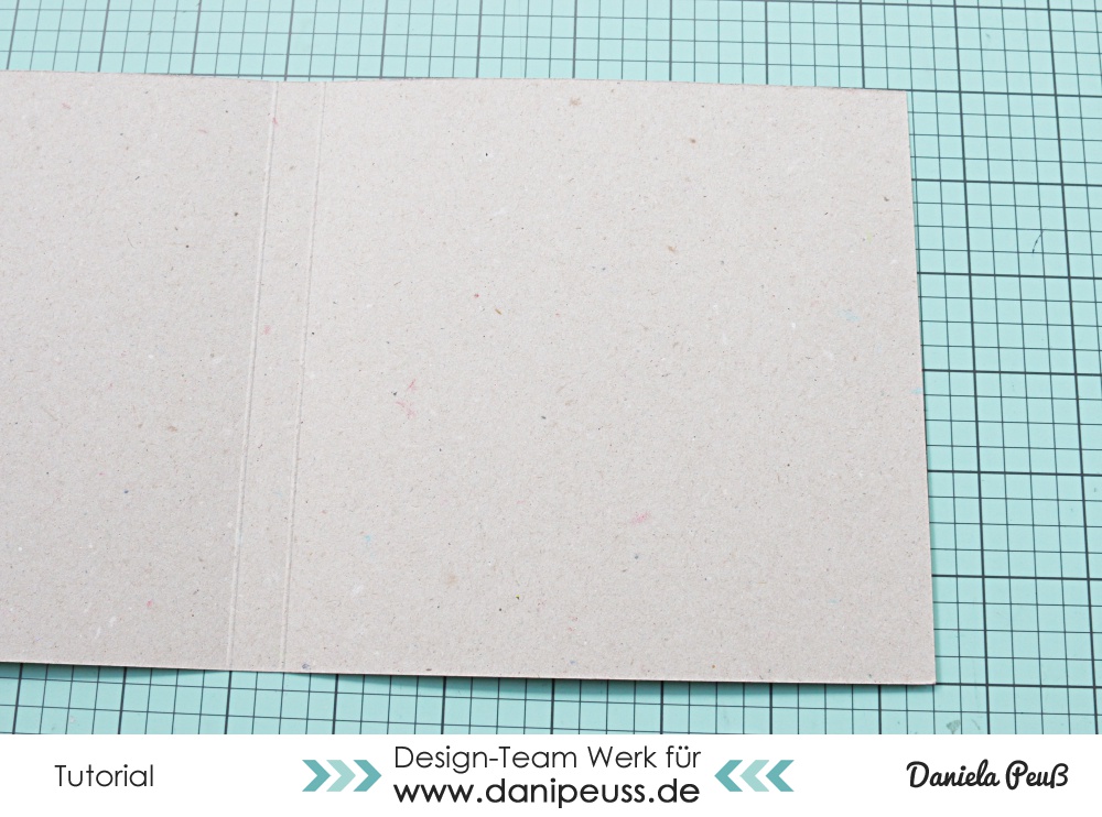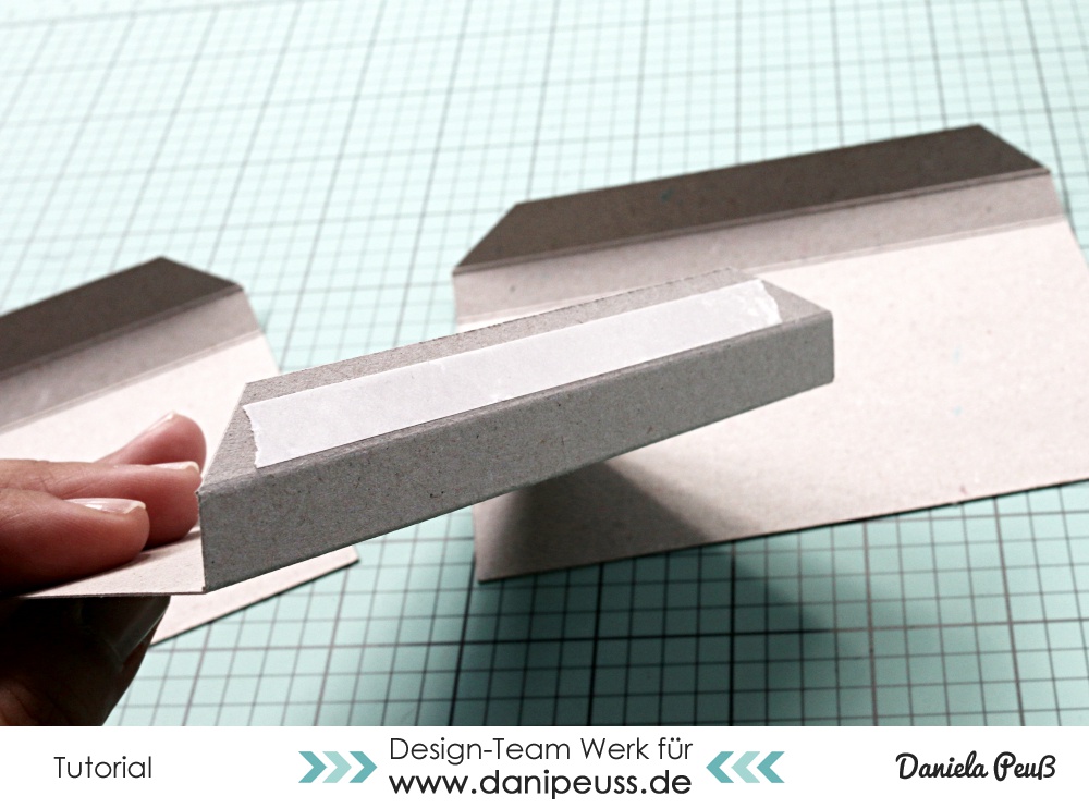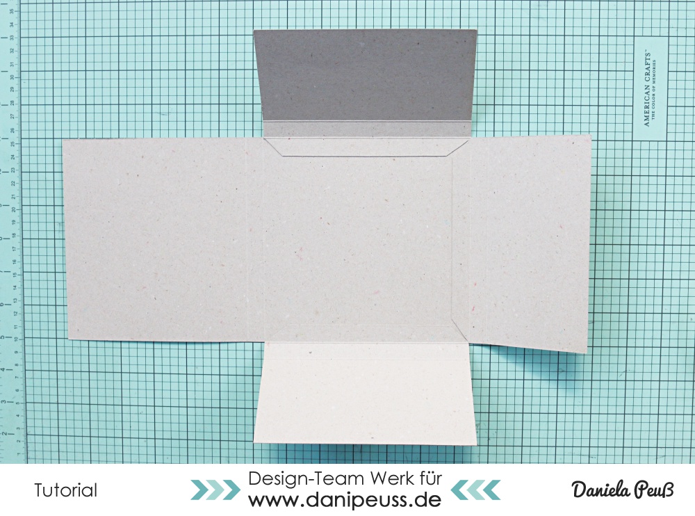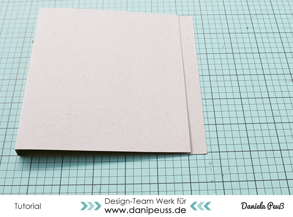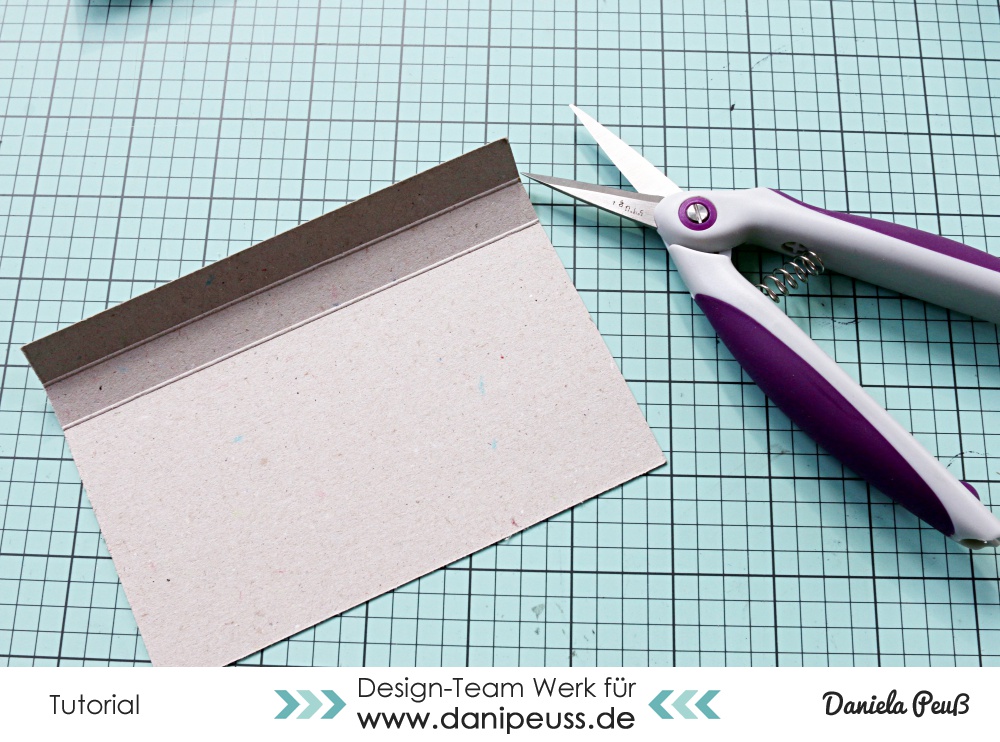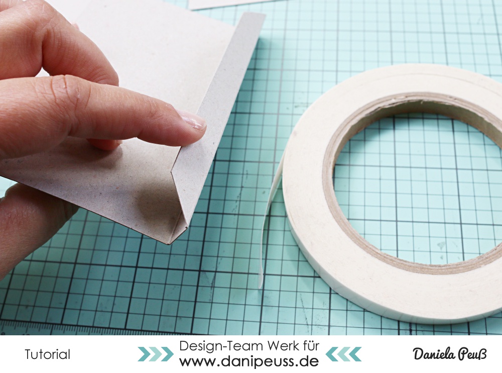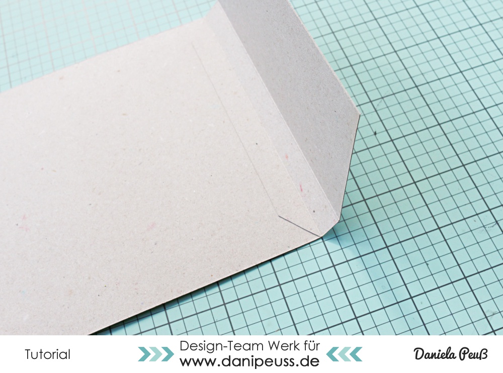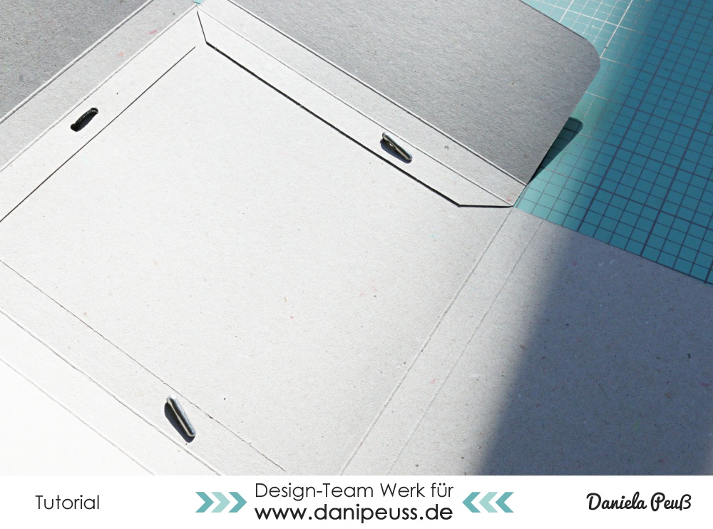 und klebt ein kleines Stück mit der Lasche direkt am rechten Rand auf. Hier kann das Raster einer Scheidematte hilfreich sein, um die Lasche direkt an den Rand geklebt zu bekommen - in jedem Fall hilft es euch, dass die Ecken abgeschnitten sind