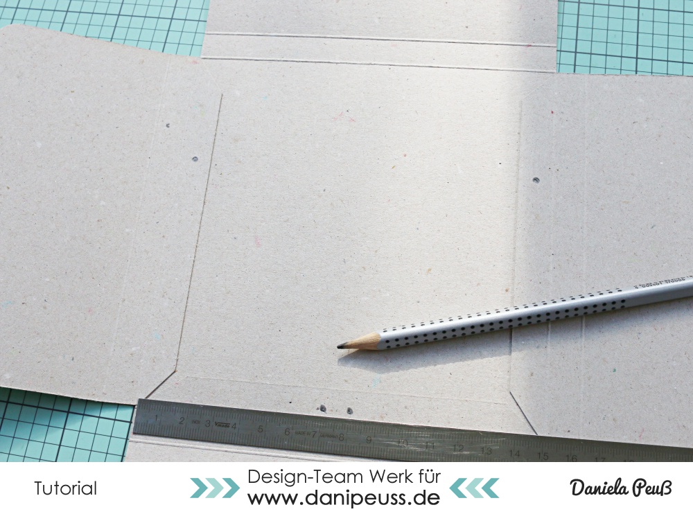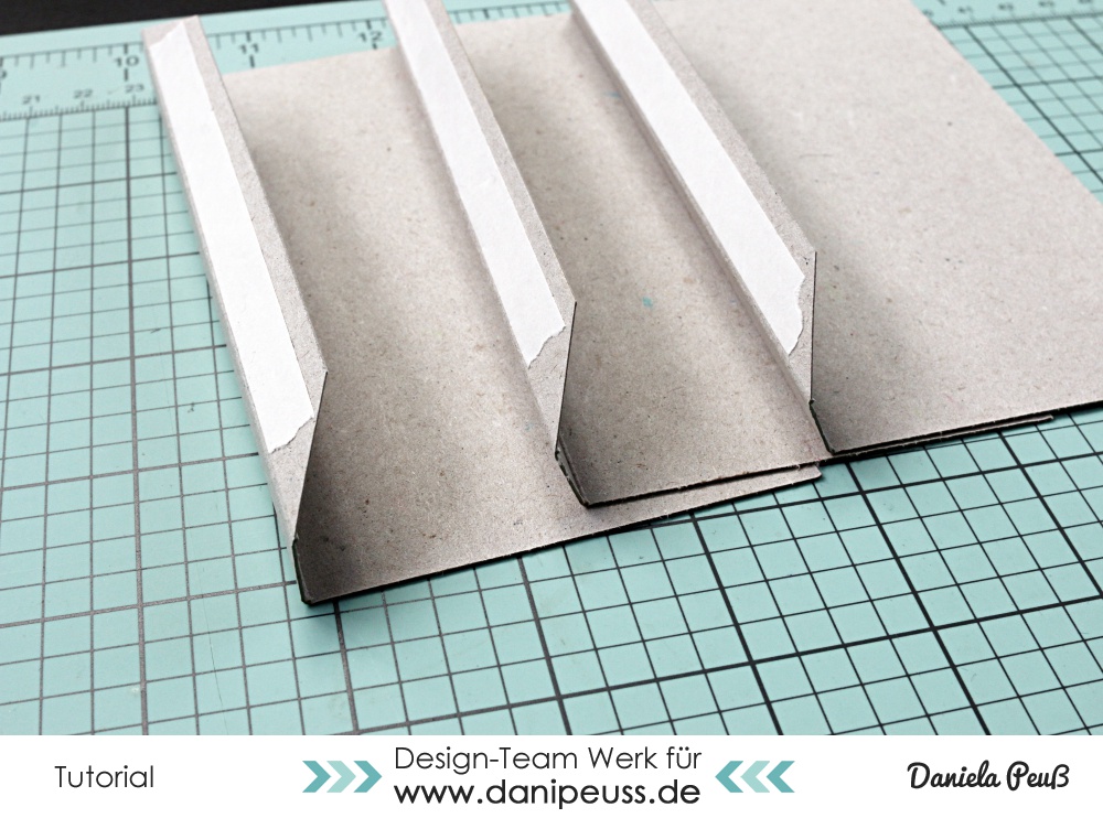Die 3 kleinen Stücke (4x12") legt ihr mit der kurzen Seite oben an und zieht die Falzlinien bei 1/2" und bei 1"