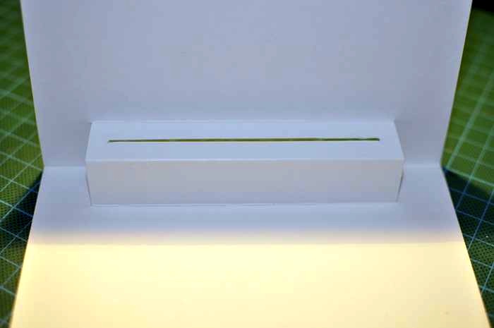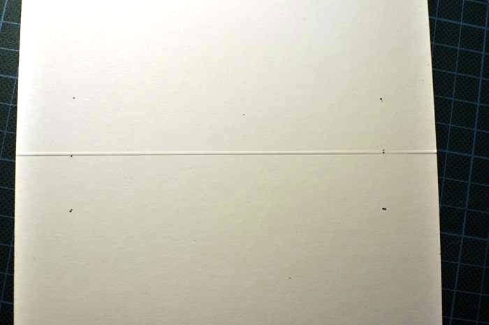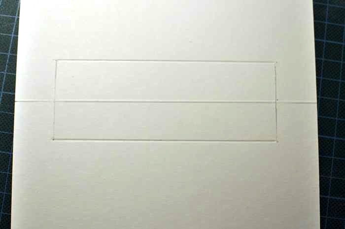 Jetzt klappt ihr bitte den Cardstock wieder auseinander, so dass er flach vor euch liegt. Schneidet anschließend einen 1mm breiten und 9,5 cm langen Schlitz in den Cardstock - und zwar 1 cm von der mittigen Falzlinie aus so wie es auf dem Foto zu sehen ist.
