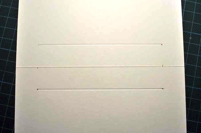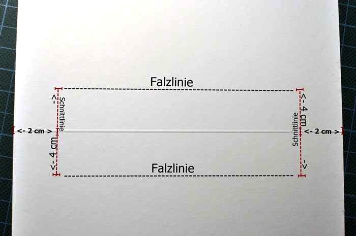 Den Cardstock jetzt bitte wenden und mit einem Bleistift Hilfspunkte 2cm vom Rand und je 2cm von der Falzlinie nach rechts bzw. links einzeichnen.