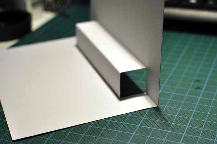 Jetzt wird es etwas knifflig. Beim zusammenfalten des Cardstock muss das gerade gefalzte und eingeschnittene nach innen und die beiden Seiten nach außen gefaltet werden. So sollte es dann aussehen.