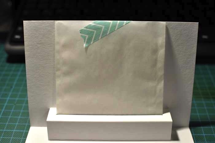 Anschließend dreht ihr die Karte um und klebt die Tüte, wie auf dem Foto zu sehen ist, auf der Rückseite fest.