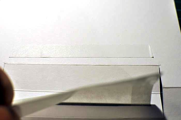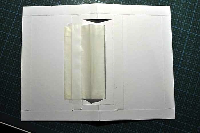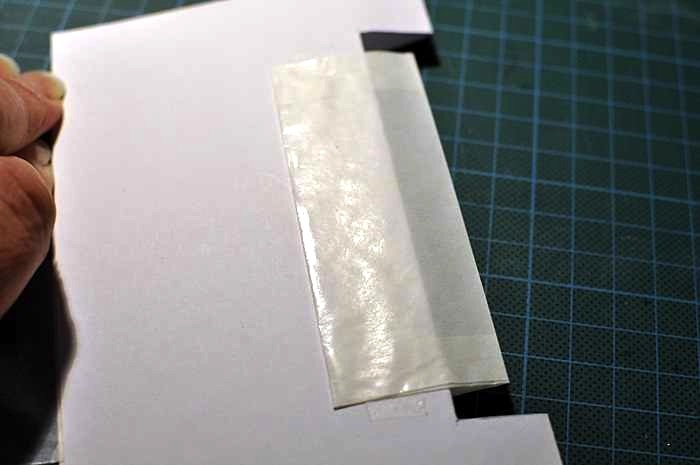 Das ganze wird jetzt wieder auseinandergefaltet und auf der Rückseite mit doppelseitigem Klebeband versehen.