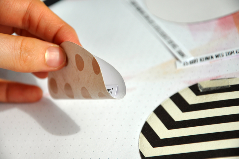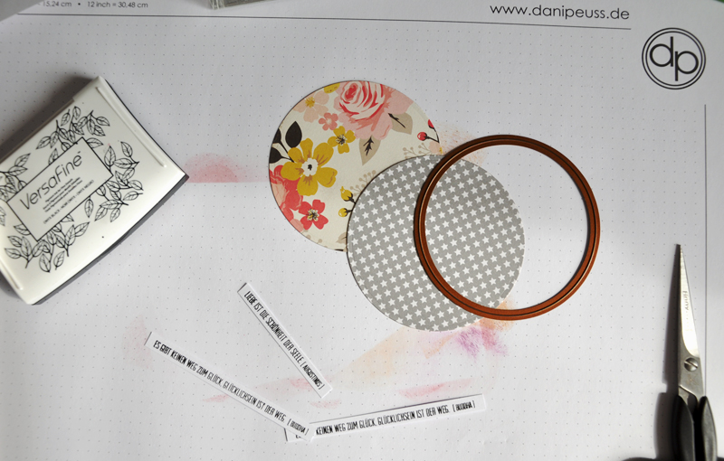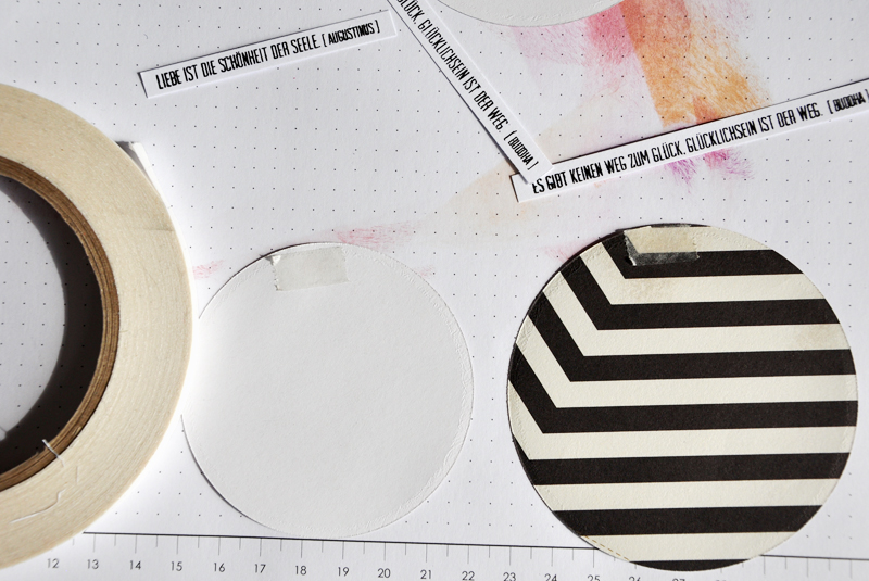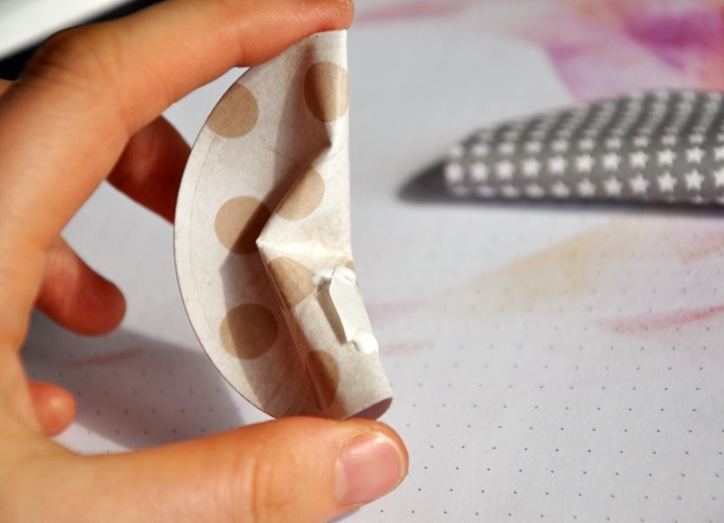 Legt den Spruchstreifen mittig auf den ausgestanzten Kreis. Klebt den Kreis zu, indem ihr oben an einer Stelle etwas Kleber auftragt.