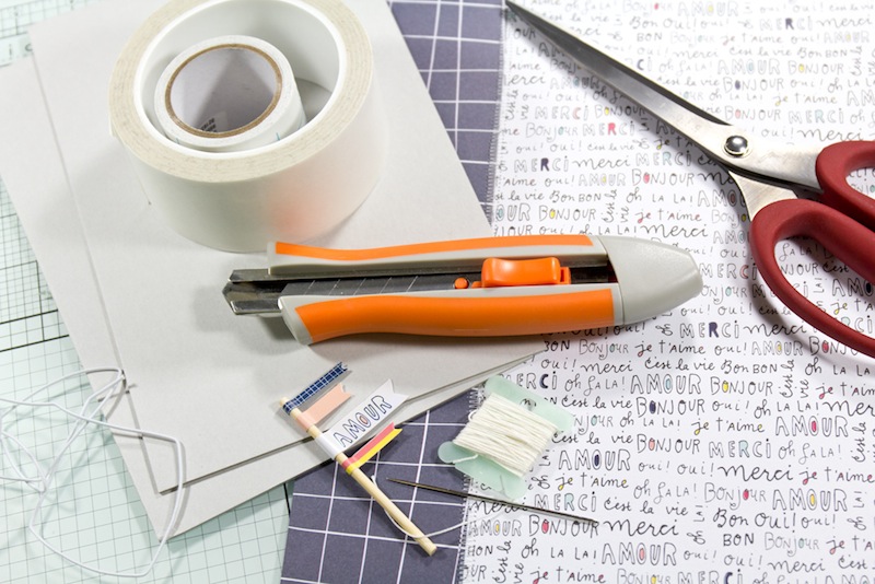 - Werkzeug wie ein Falzbein, Cutter, Stahllinial, Glasmatte