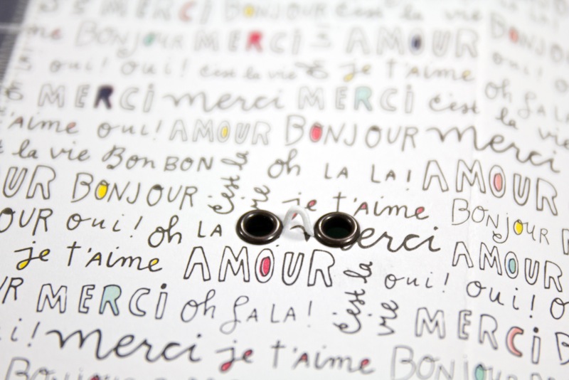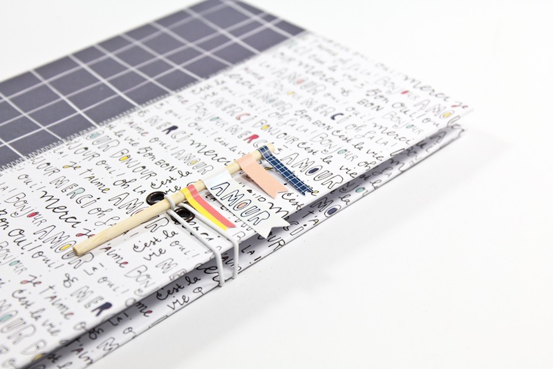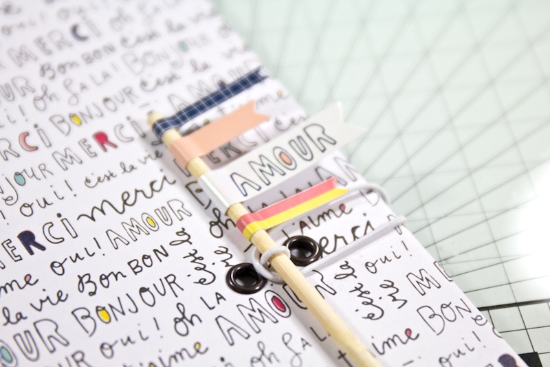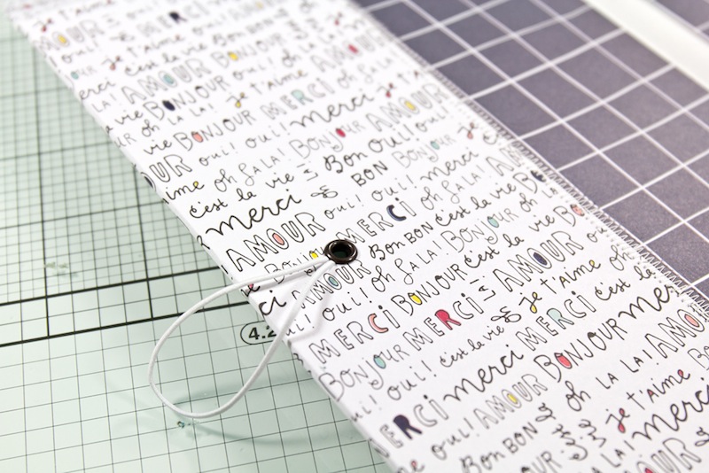 Bevor ich die Seiten von innen mit weißem Cardstock kaschiert habe, habe ich noch Schlaufen aus Gummiband mit Eyelets und der Crop A Dile an den Buchdeckeln befestigt.