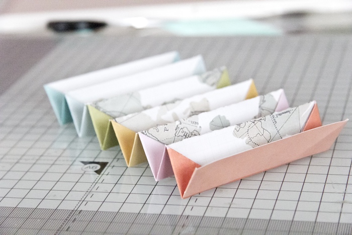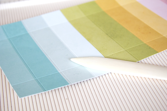 Aus dem Maikit habe ich mir das bunt gestreifte Papier geschnappt und über die Breite von 12" einen Streifen von 5,5" Höhe geschnitten.