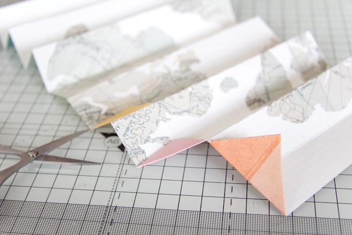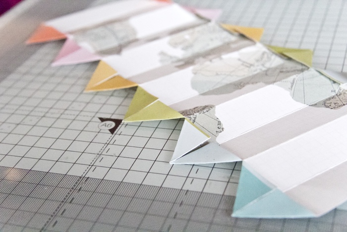 Der Streifen wird bei 2" und 4"... und 10" bis zum Querfalz eingeschnitten und die freien Ecken werden umgeknickt, dass sie aussehen wie kleine Hausdächer.