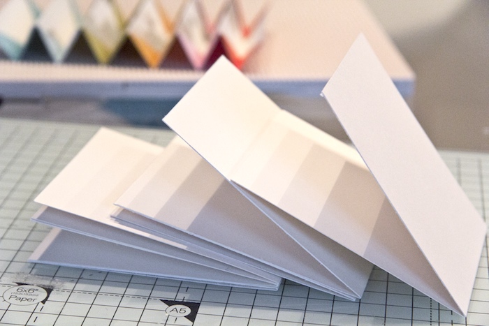 Den Streifen habe ich quer auf mein Falzbrett gelegt und bei jedem vollen Inch genutet. Dann um 90° gedreht und bei 1" und bei 4,5" ebenfalls eine Falzlinie gezogen. Der Länge nach einmal als Zieharmonika falten und wieder öffnen.