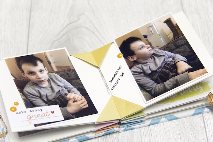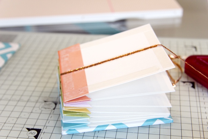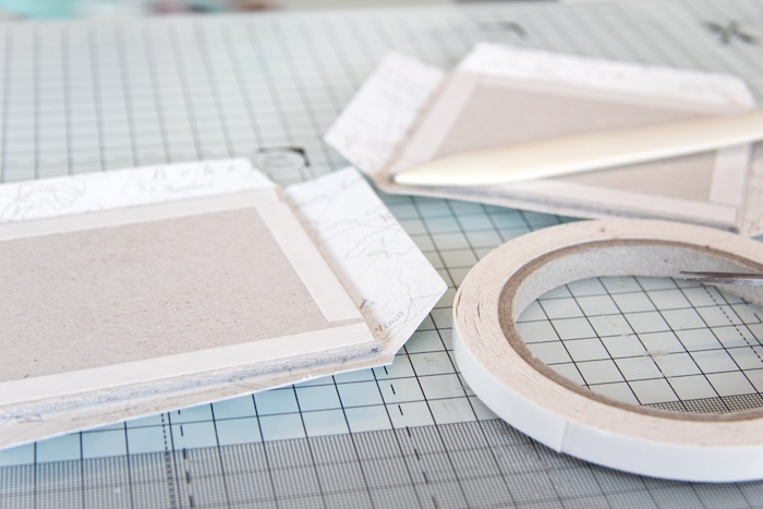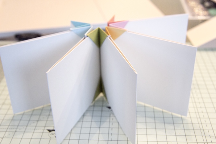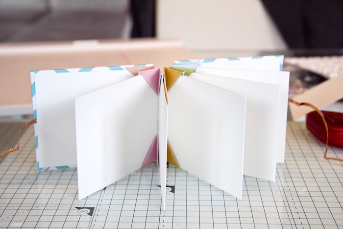 An den schmalen Seiten wird innen doppelseitiges Klebeband aufgebracht, so lassen sich die Seiten auf den Buchrücken setzen. Auf dem Bild kann man es ganz gut sehen.