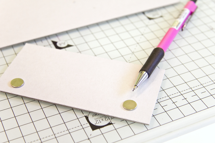 Um die Magnete verschwinden zu lassen, müssen passende Löcher in den Karton gestanzt oder geschnitten werden. Ich zeichne dazu zuerst an dem 6 cm breiten Stück mithilfe der Magnete passende Kreise an...