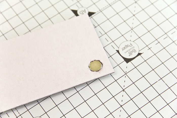 Wenn die Graupappe dicker ist als der Magnet, ist es sinnvoll den Unterschied mit Cardstock auszugleichen. Das fertig gelochte Graupappestück legt Ihr nun auf den später oben liegenden Buchdeckel und übertragt die Stellen für die Magnete, damit sie auch wirklich deckungsgleich übereinander liegen. Am besten markiert Ihr noch, wo oben und unten ist, damit da kein Fehler passiert - es wäre ja schade, wenn sich das Album später beim Verschließen verzieht.