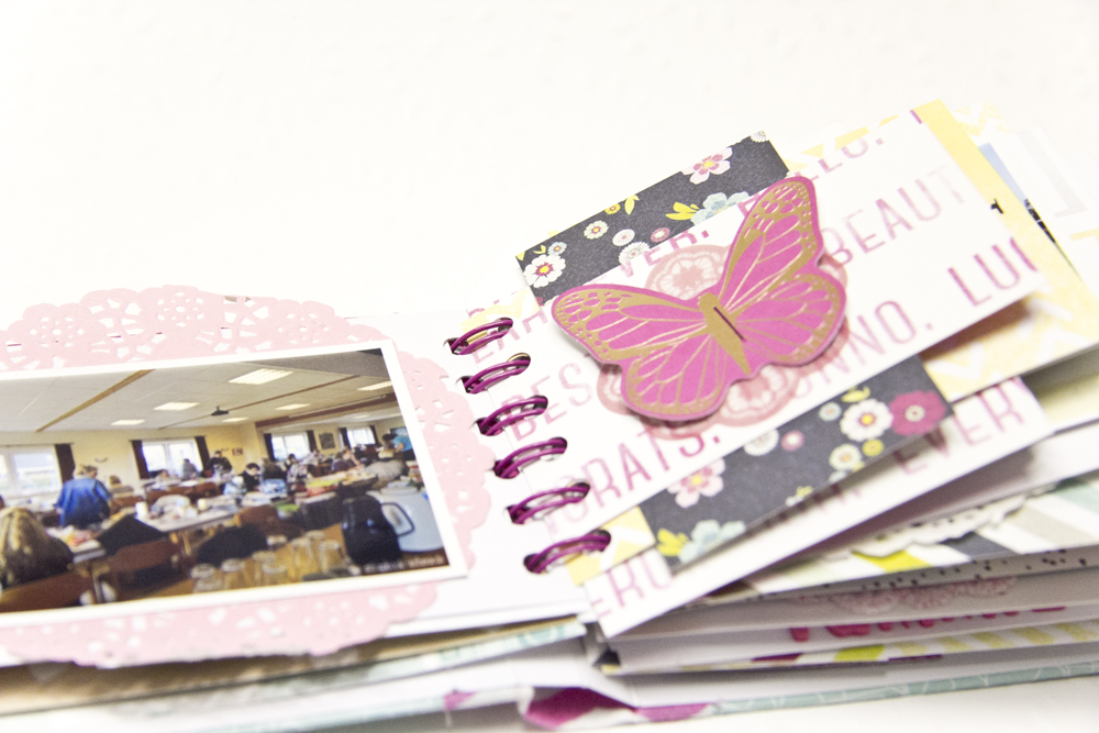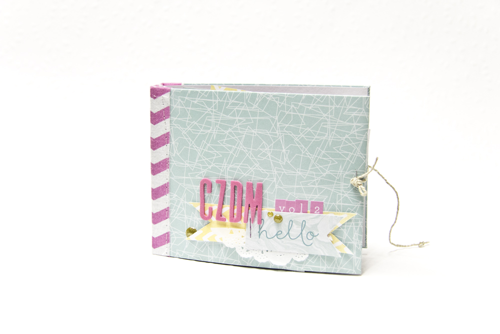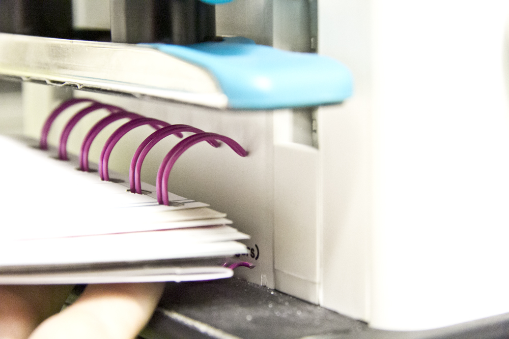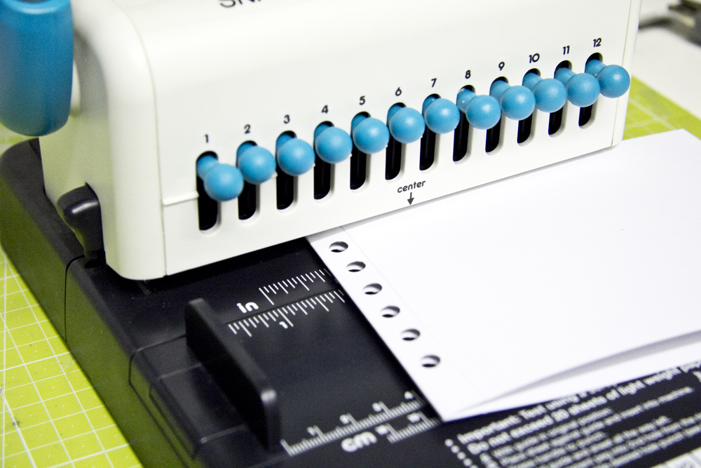 Locht auch die Papiere für Eure Seiten und bindet die zusammen mit dem immernoch gefalteten Cardstockstück in Eurem Bindegerät. Danach faltet Ihr den Cardstock an den beiden genuteten Linien, daß er wie ein Paar Buchdeckel um die Seiten liegt.