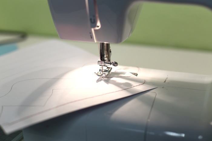 Näht bis zur Ecke (eventuell Stichlänge verkürzen um zu treffen!) und lasst die Nadel abgesenkt. Hebt den Nähfuß und dreht das Papier. Nähfuß wieder absenken und weiter geht´s!