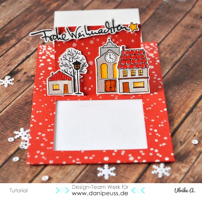Mit den knuffigen Häusern vom Klartext-Stempelset "Winterdorf" hab ich die Karte dann aufgehübscht.