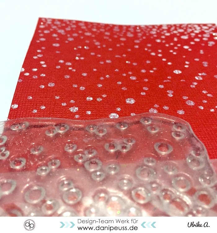 Zum weiteren Stempeln der Schneeflocken habe ich dann den Stempel umgedreht. Also das dichte "Schneegestöber" nach unten und die vereinzelten Schneeflocken nach oben. Denn jetzt werden nur noch die vereinzelten Schneeflocken abgestempelt und embosst. Ich hab also die Karte soweit unter das Transparentpapier geschoben, das beim Abstempeln nicht mehr das "Schneegestöber" drauf kommt.