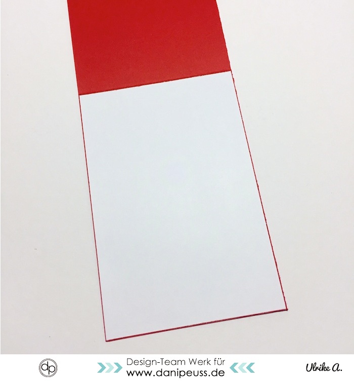 Als erstes hab ich mir ein Stück Cardstock auf 4 1/4" x 12" zugeschnitten und in der Mitte (bei 6") gefalzt.