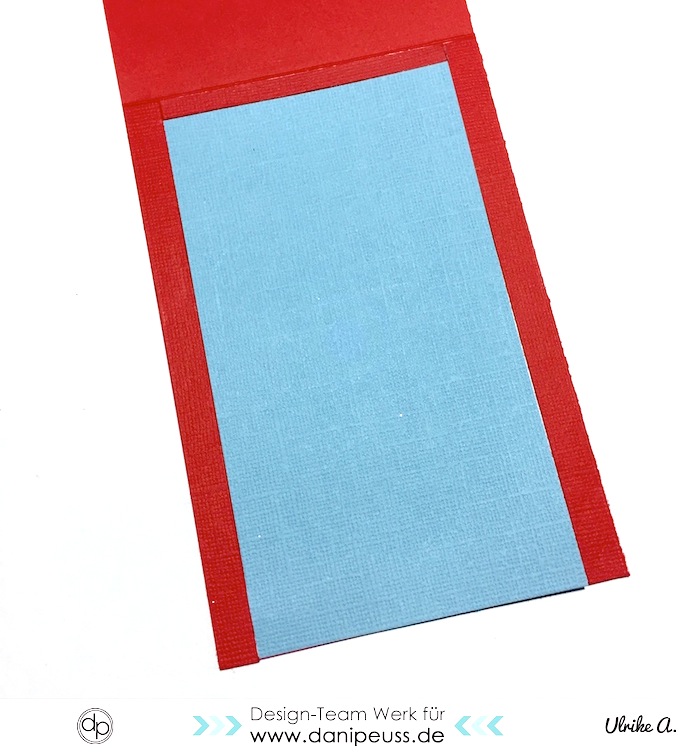 Vor dem Zusammenkleben der Karte habe ich noch das Innenteil zugeschnitten und eingepasst. (Der blaue Cardstock ist nur ein Muster zum besseren Erkennen.)