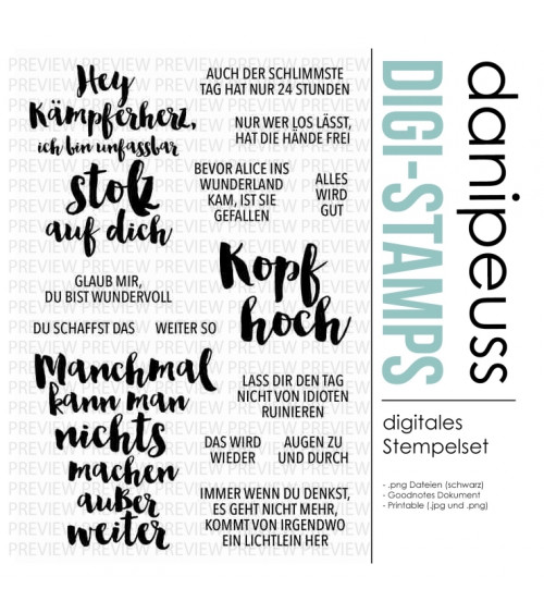 Die digitalen Stempel und Printables sind für den rein privaten Gebrauch bestimmt. Bei Interesse an einer kommerziellen Nutzung besteht die Möglichkeit, eine Lizenz hierfür zu erwerben. Bitte Kontaktaufnahme unter info@danipeuss.de
