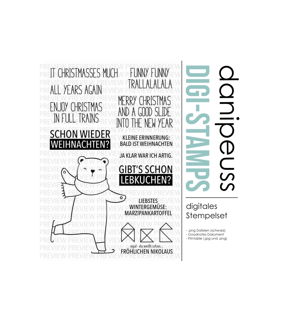 Die digitalen Stempel und Printables sind für den rein privaten Gebrauch bestimmt. Bei Interesse an einer kommerziellen Nutzung besteht die Möglichkeit, eine Lizenz hierfür zu erwerben. Bitte Kontaktaufnahme unter info@danipeuss.de